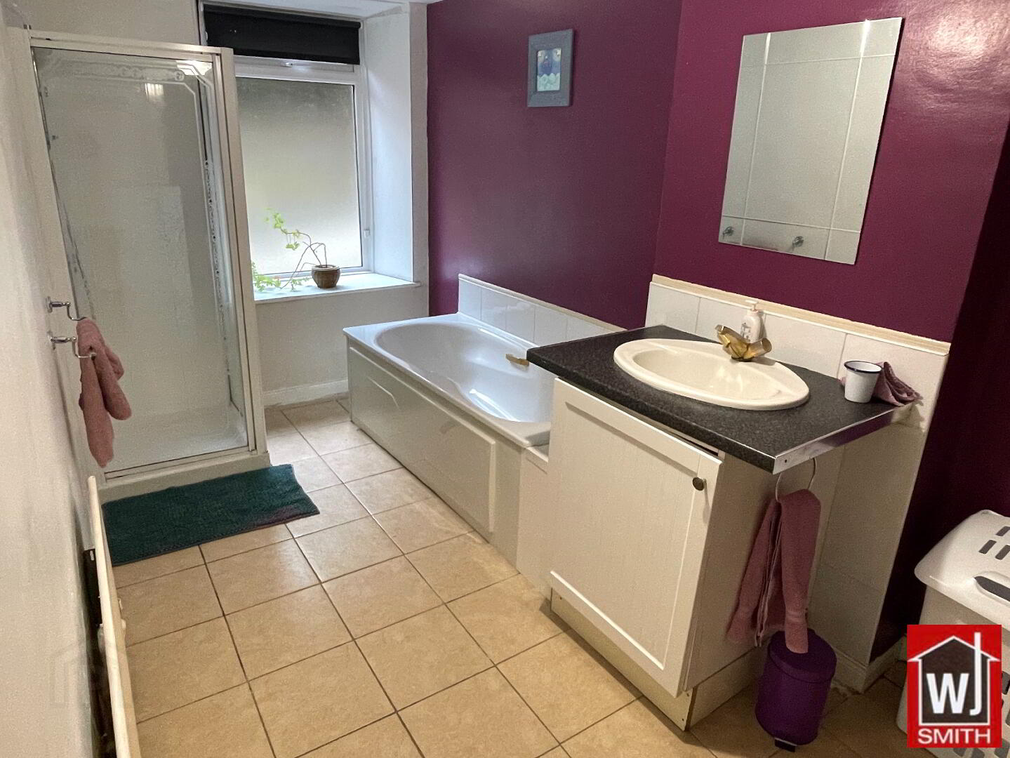 Bathroom – 17’01” X 7’00” White Bathroom Suite with Corner Power Shoer; Sink with Vanity Unit; Extractor Fan; Tiled Floor