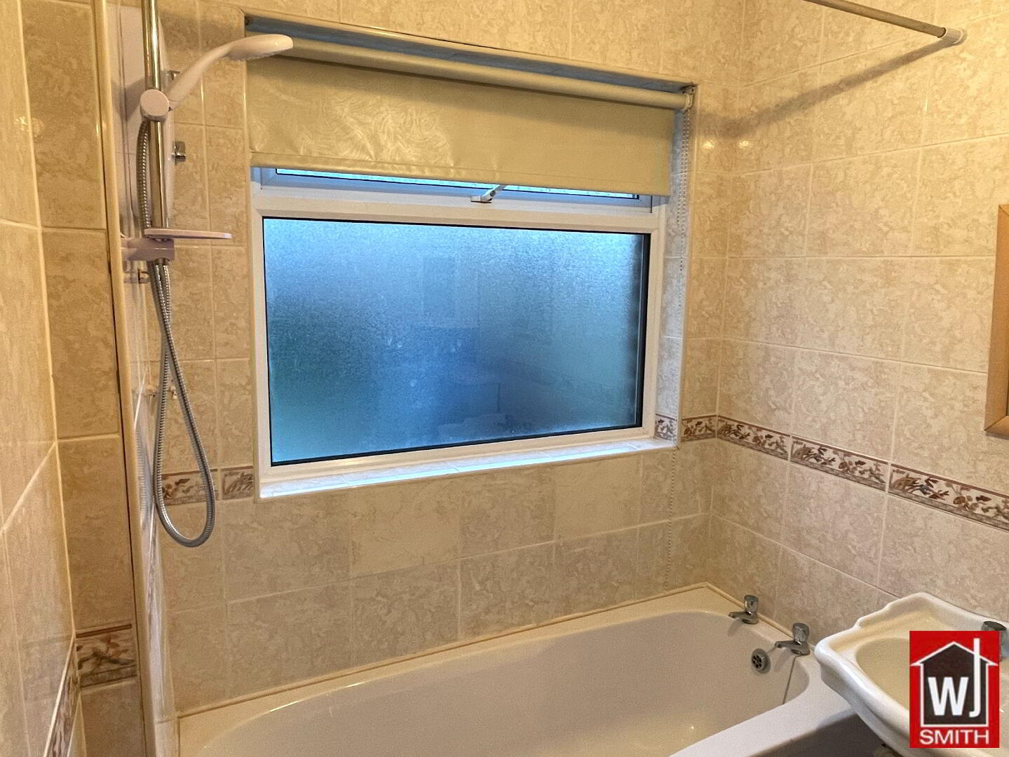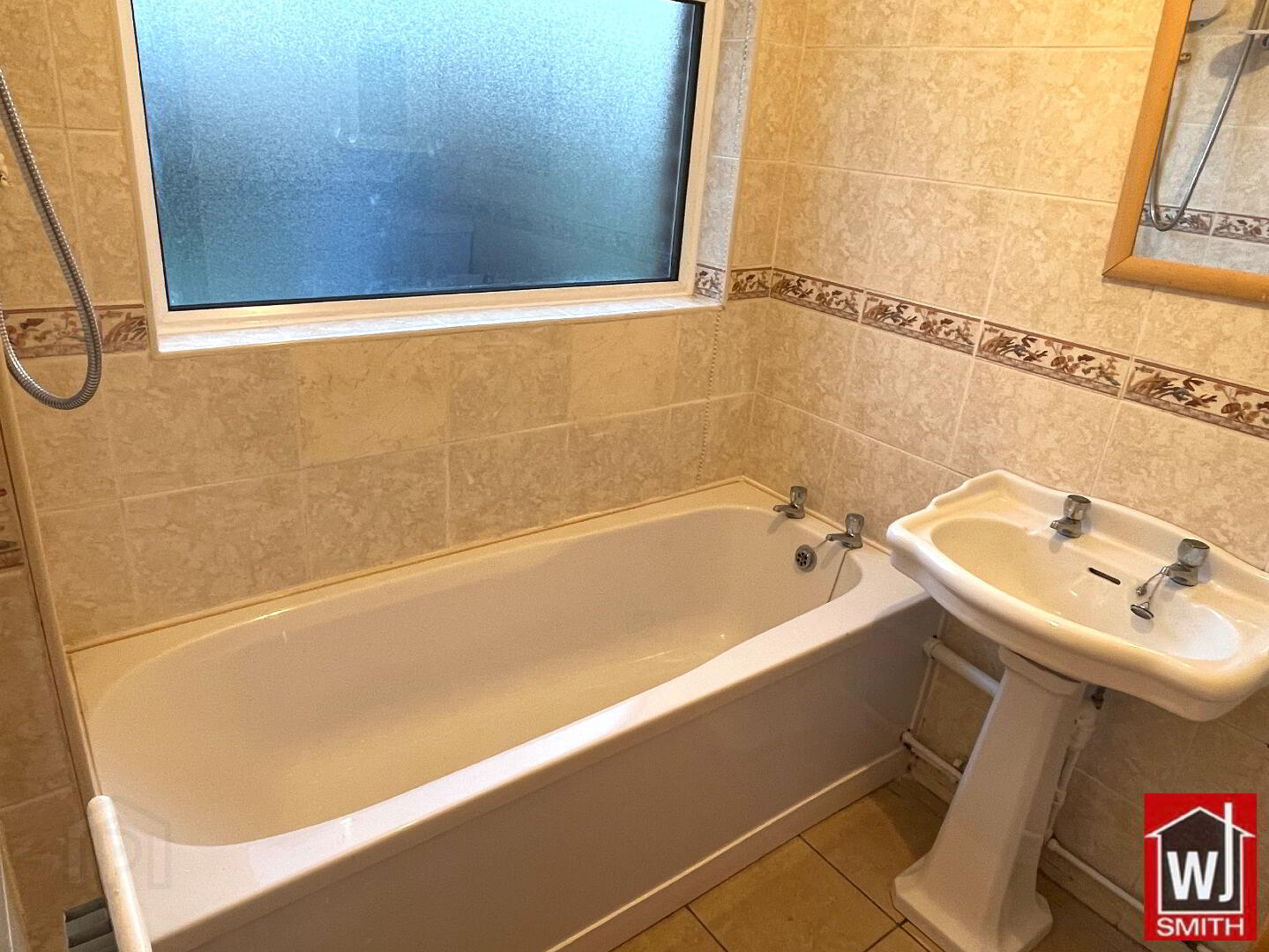 Bathroom – 5’07” X 6’03” White Bathroom Suite; Electric Shower over Bath; Fully Tiled Walls; Tiled Floor