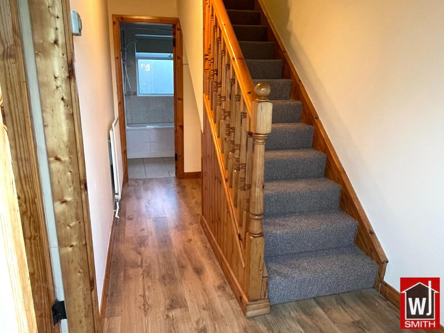 Hallway – 12’08” X 5’08” Pine Stairs and Ceiling; Storage Under Stairs; Oak Laminate Wood Flooring