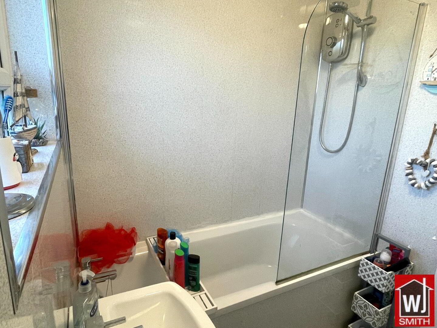 Bathroom – 5’06” X 6’02” White Bathroom Suite with Electric Shower over Bath; Fully Panelled Walls and Roof with Chrome Trim; Extractor Fan