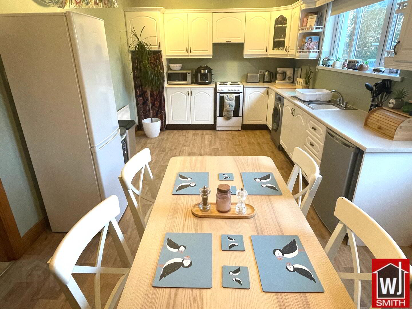 Kitchen/Dinette – 18’11” X 10’04” White Kitchen Units with Cream Worktop; Tiled Between Units; S.S. sink with mixer taps; Location for Electric Cooker & Fridge; Plumbed for Automatic Washing Machine; Under Stairs Storage