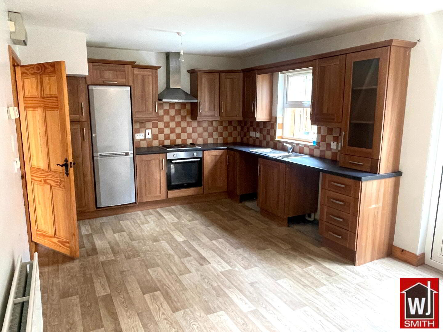 Kitchen/Dinette – 18’07” X 11’03” Oak Wood effect kitchen units with Granite Style worktop; Tiled Between Units; S.S. sink with mixer taps; Electric Oven, Hob and Extractor Fan, Fridge/Freezer; Plumbed for Washing Machine; Double PVC French Doors to Rear