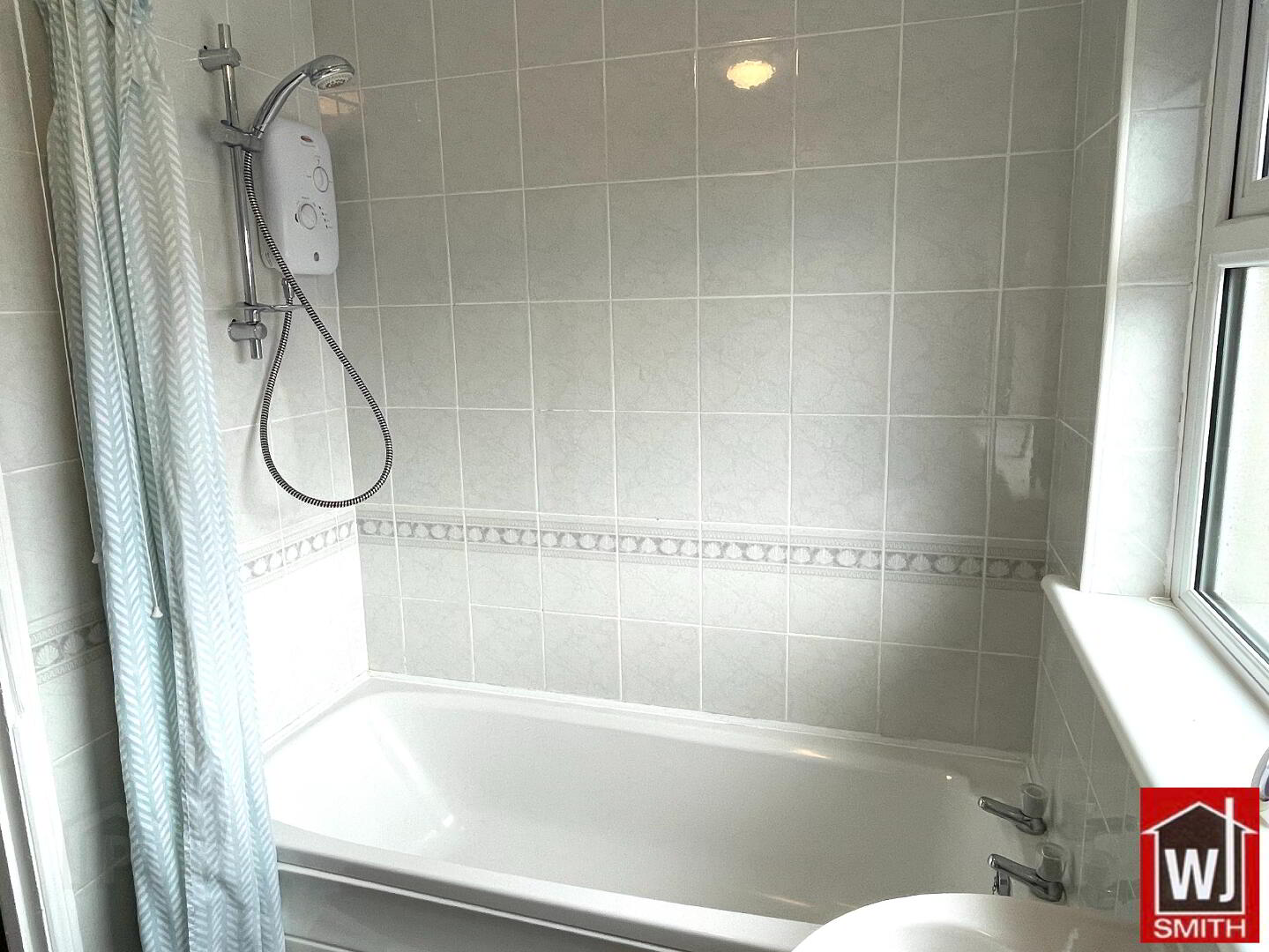 Bathroom – 5’05” X 7’03” White Bathroom Suite with Electric Shower over Bath; Fully Tiled Walls