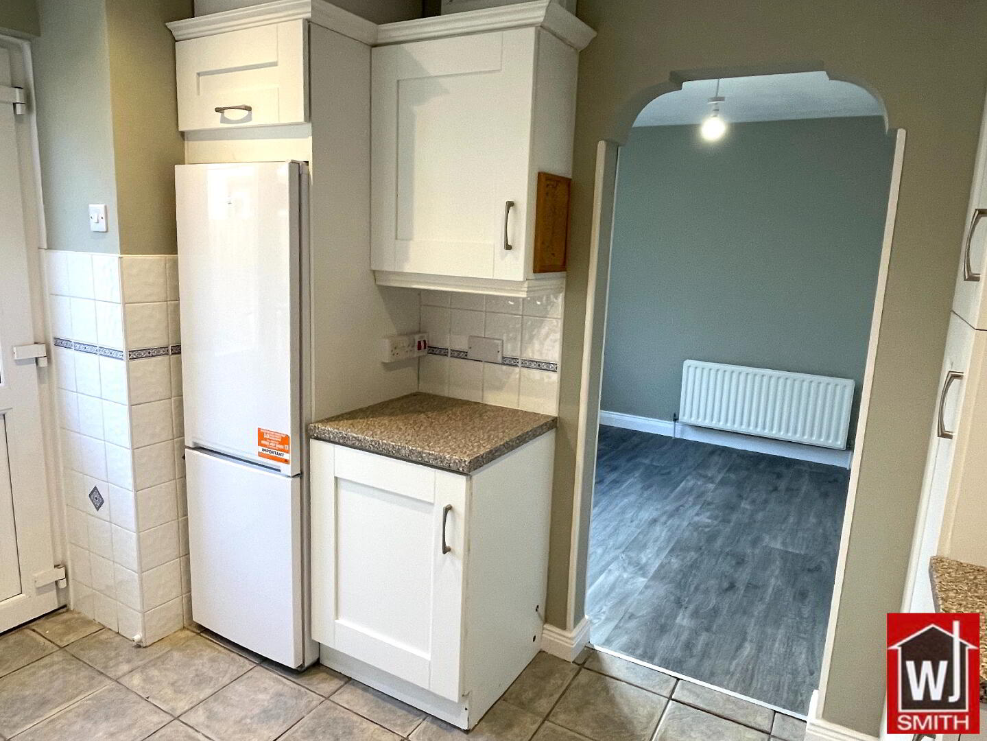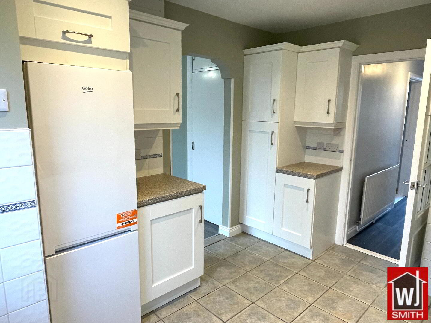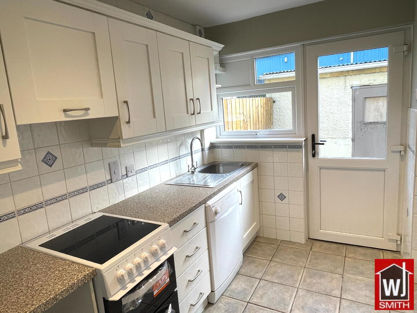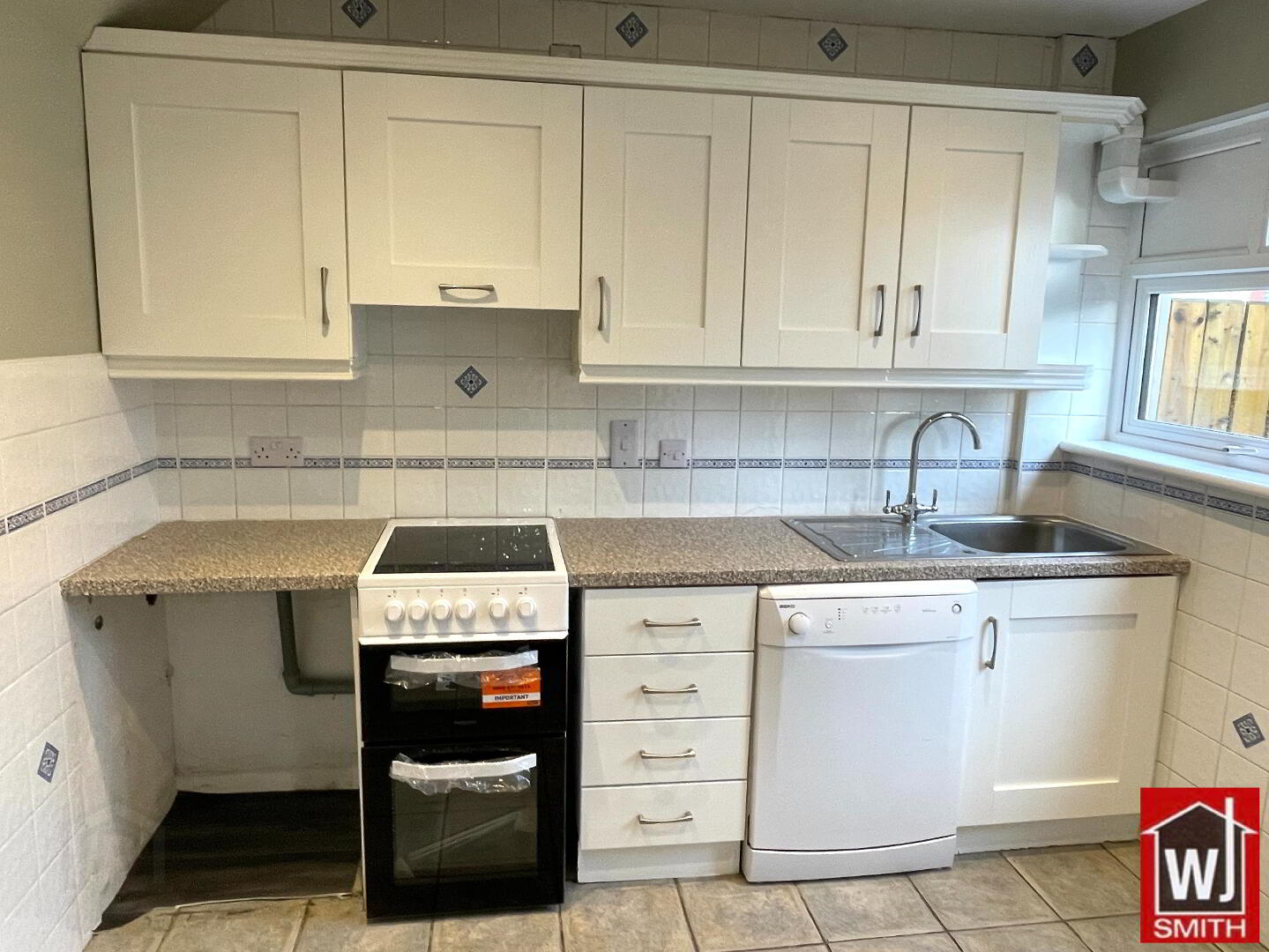 Kitchen – 9’05” X 9’01” White Shaker style Kitchen units with Granite effect Worktop; Tiled between Units; S.S. sink with mixer taps; New Electric Cooker and Fridge/Freezer; Plumbed for Automatic Washing Machine and Dishwashers; Extractor Fan; Tiled Floor