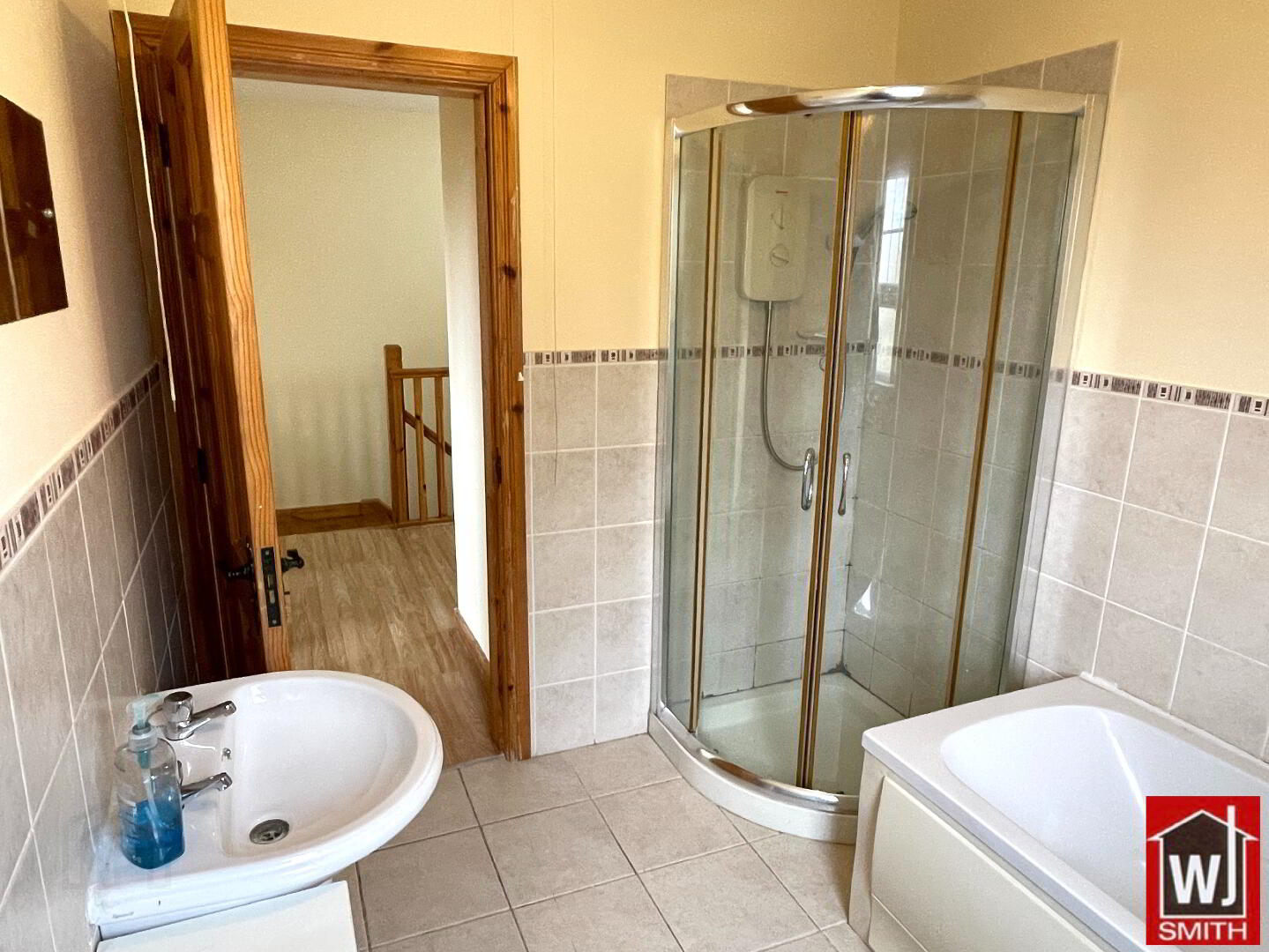 Bathroom – 8’08” X 6’11” White Bathroom Suite; Corner Electric Shower; Extractor Fan; Half Tiled Walls; Tiled Floor