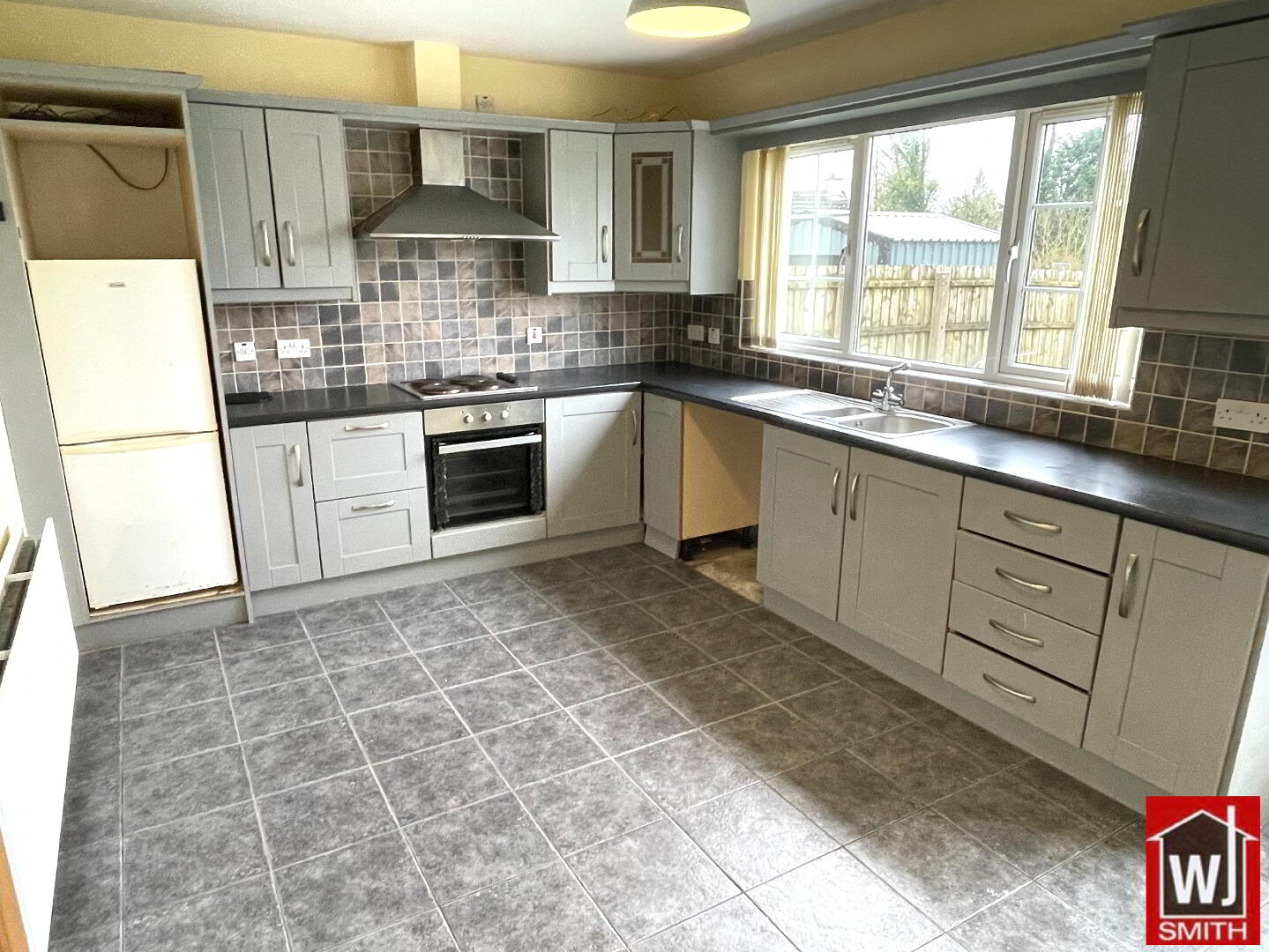Kitchen/Dinette – 14’11” X 10’09” Grey Kitchen Units with Granite Style Worktop; Tiled Between Units; S.S. sink with mixer taps; Electric Cooker; Hob & Extractor Fan; Location for Fridge/Freezer; Tiled Floor